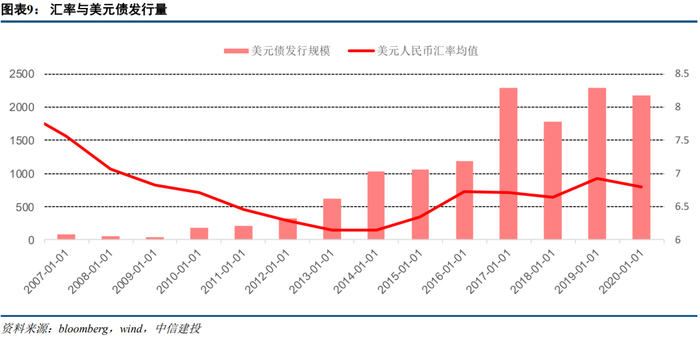 当企业发行外债的资金流入境内使用时,发行人不仅需要支付票息,还要面临汇率波动带来的汇兑损益。当人民币处于升值周期时,企业偿付外债的压力减轻,因此发行美元债的意愿会加强,例如2015年之前虽然直接发行美元债困难,但2010-2013年人民币处于升值周期,境内外存在套利空间,发行人通过间接发行(维好协议、跨境担保)和红筹结构的方式绕道,促进了美元债市场的蓬勃发展,发行规模从2007-2009年的年均86.15亿美元大幅增长至2013年的620.67亿美元。而当人民币处于贬值周期时,企业考虑到美元负债的财务成本等因素,发行主体的发债意愿有所减弱,例如人民币贬值的2014-2016年和2018年。