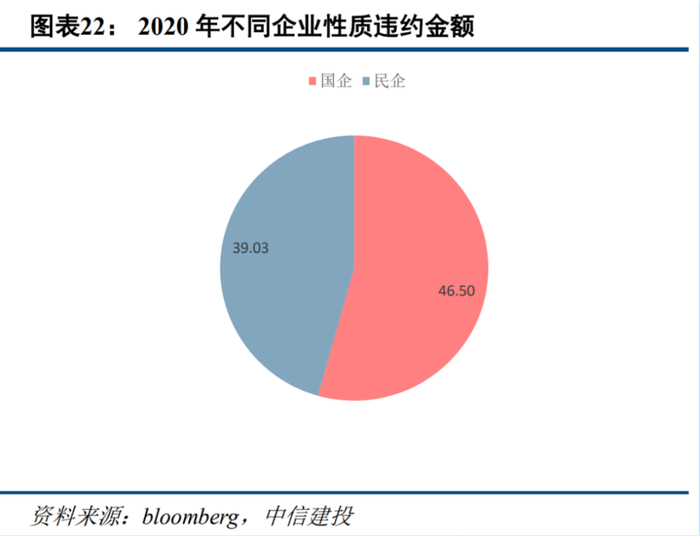 从违约主体的构成上来看,之前民企是境外市场违约主体,但2020年以来北大方正和紫光集团违约,使得国企/央企违约金额大幅上升,超过民企违约金额。从违约原因来看,除了基本面下滑等原因,公司治理引起的违约风险加剧,使得投资者对于民企的风险偏好进一步下降,加剧了民企融资困境,形成恶性循环。而国企债务负担重,盈利持续亏损则考验着政府兜底的意愿和能力,由于境内外发行人重合度较高,境内国企打破刚兑对于美元债的传染性较强。