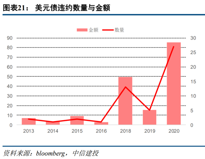 在2017年之前美元债仅有零星违约,整体违约率保持低位。但是近年来,中资美元债违约开始明显提升,2020年美元债违约数量达到27只,金额达85.53亿美元,按照2020年底存量美元债计算,违约率攀升至1%左右。