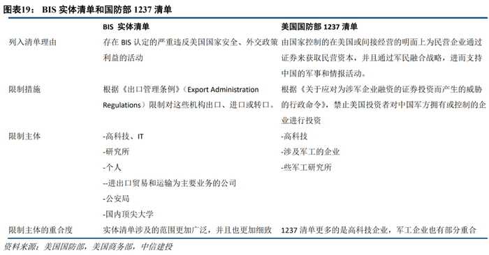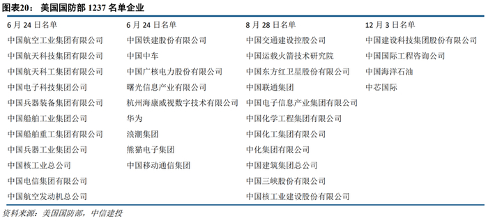 中美关系依然面临较大不确定性,回到过去的概率偏低。中国已被定位为长期竞争威胁,贸易科技冲突背后是美国对华战略的改变。2020年以来美国国防部清单(DoD list)和美国商务部BIS新增 entity list(实体清单)不断扩容,针对中资企业限制频繁。其中商务部BIS 实体清单主要为企业供应链层面的限制,清单上的企业将被限制购买美国相关商品和技术;而 1237清单则更多影响企业在资本市场的表现,2020年11月12日,特朗普签署行政命令,禁止美国主体交易中国军事企业公开发行的证券、衍生证券等金融产品,并将于 2021 年 1 月 11 日生效。