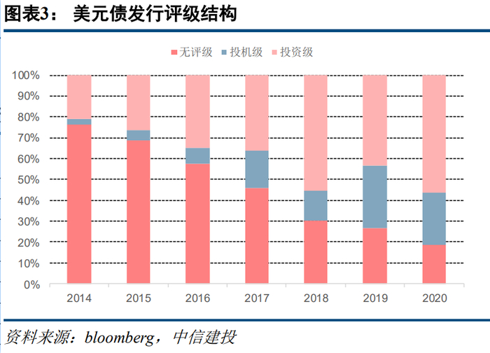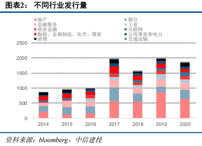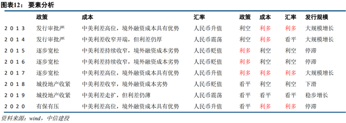 2020年由于新冠疫情的冲击,海外央行投放大量流动性,人民币升值叠加融资成本压低,投资级的发行能力和发行意愿都处于正向区间,很大程度上弥补了地产、城投的发行量的下滑。