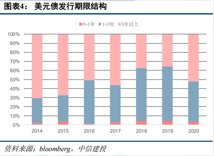 从评级结构来看,2020年投资级品种发行放量,我们认为有如下几个原因:1、年初央行、外管局联合发布《关于全口径跨境融资宏观审慎管理有关事宜的通知》,将宏观审慎调节参数上调至1.25,提高企业融资上限,鼓励企业利用境外低成本资金;2、随着美债无风险利率的下降,投资级美元债的发行成本一路下探,与境内融资成本相比具有一定优势;3、人民币升值预期下,企业外债偿付压力减轻,强化发行意愿。期限结构来看,2020年美元债的发行期限有所拉长,5年期以上的占比大幅提高。我们认为一方面在于年初房地产行业抓住窗口期进行债务置换滚动,而市场预期内房高息债券供给减少,投资热情较高,市场供需两旺下,房企普遍拉长债务期限。另一方面由于2020年投资级发行占比提升,市场对于其长期限的接受度较高,且由于投资级收益率保持低位,因此投资者更多向久期要收益。
