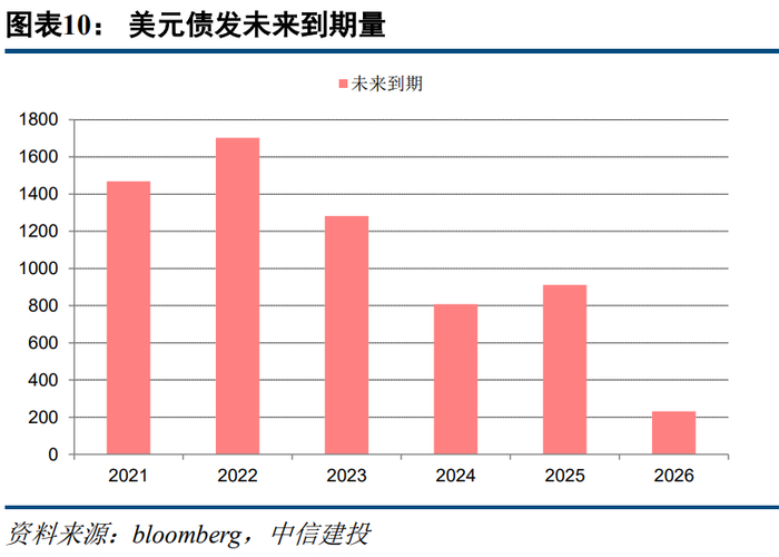 3、企业发行能力和发行意愿通常呈现此消彼长的关系,例如地产为主的高收益板块发行美元债意愿强烈,但发行能力受到政策监管的制约;而优质投资级企业发行能力受到政策鼓励,但发行意愿受成本和汇率等因素约束。