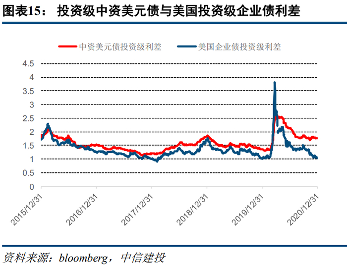 当然一级定价主要参考二级市场可比价格。由于在境外发行,美元债的无风险利率以美国国债利率为锚,信用利差由境外流动性溢价、企业风险溢价组成。而国内的债券估值以中国国债为锚,信用利差以境内流动性溢价占主导,因此中美两国无风险利率和境内外流动性的变化趋势决定了未来两者发行成本,在后文中将做进一步探讨。