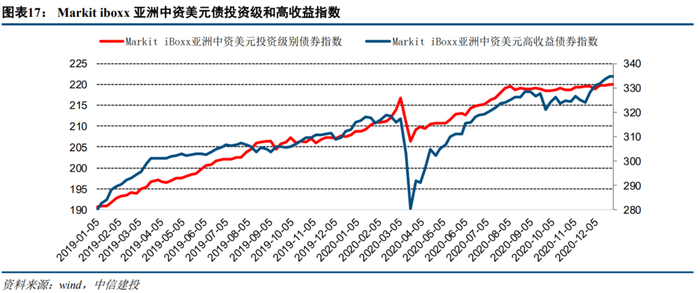 整体而言,2020年Markit iboxx亚洲中资美元债投资级和高收益指数的年度涨幅为5.78%和6.37%,高收益在最后一个月大幅上涨反超投资级收益。从投资价值的角度来看,美元债的高收益市场交易更加活跃,给与风险偏好较高的机构更多收益空间。而从违约风险的角度来看,中资美元债违约比例较国内债券市场低,一方面源于出境发债企业通常资质良好,另一方面也源于发行中资美元债需要发改委审批,政策一定程度上已经把过一道关。此外,站在大类资产配置的角度考量,由于中资美元债信用基本面主要与国内相关,而流动性方面与全球流动性更加紧密,因此中资美元债可以一定程度降低整体资产组合的波动率,对冲风险,2020年体现的尤为明显。从过去5年的年均收益来看,中资美元债的收益/风险仍然具有吸引力,但2020年的波动也敲响了警钟。