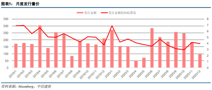 二级估值:美元债的危与机。2020年的美元债二级市场和境内债券市场走势恰好相反,境内债市收益率先下后上,而美元债收益率则在3月全球流动性紧张下推至高点,之后随着美联储放水和基本面企稳,市场开启反弹之路。整体而言,2020年Markit iboxx亚洲中资美元债投资级和高收益指数的年度涨幅为5.78%和6.37%。中资美元债可以一定程度降低整体资产组合的波动率,对冲风险,2020年体现的尤为明显,但2020年的波动也敲响了警钟。从投资价值的角度来看,高收益信用利差为720BP左右,近5年中资美元高收益级利差均值在590BP,仍有一定空间,且大幅高于美国高收益利差近350个BP。当前全球流动性宽松,资产荒加剧。未来影响美元债二级估值的因素有1、美债收益率的上行;2、境内国企点状违约带动利差走阔;3、交易层面上的做空机制加剧波动;4、中美摩擦对资本市场的事件冲击。