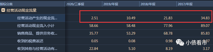 值得注意的是,在业绩下滑的同时,鹏博士的经营获现能力也在不断恶化。其经营性现金流净额从2015年的46.58亿一直下滑至2019年的10.49亿元,2020年前三季度仅录得2.51亿元。