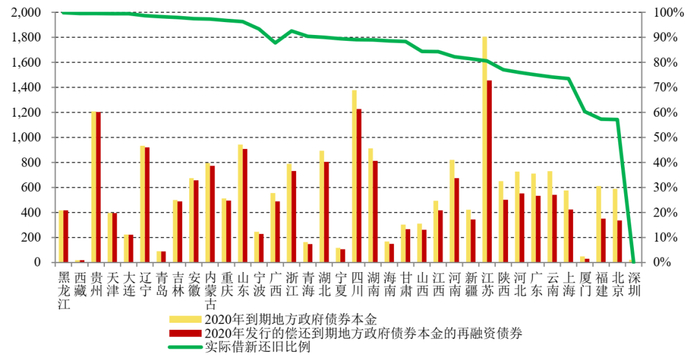 注:实际借新还旧比例=各区域2020年发行的偿还到期债券本金的再融资债券额度/各区域2020年到期地方政府债券本金