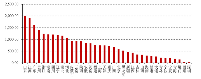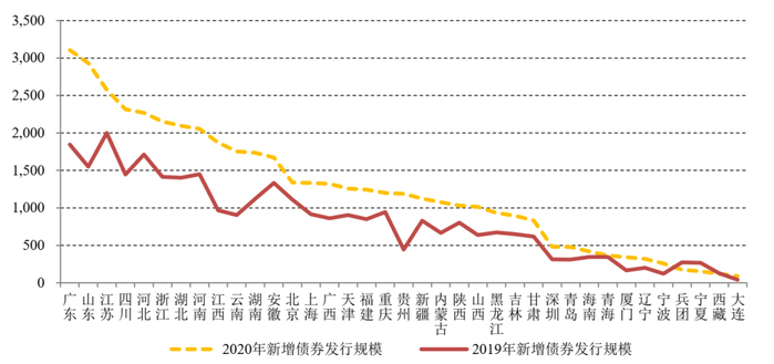 从各区域新增债券限额看,根据《新增地方政府债务限额分配管理暂行办法》(财预〔2017〕35号文)公布的新增债限额分配正向激励规则,辽宁、贵州等债务负担较重、举债空间小的区域新增债券发行规模将较小;江苏、广东、山东等东部较发达省份,由于其财政实力强、举债空间大且债务管理绩效好,预计2021年其仍然将维持较大规模的新增债务额度。