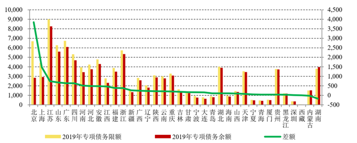 图6:各区域2019年末专项债务限额与余额差值(单位:亿元)