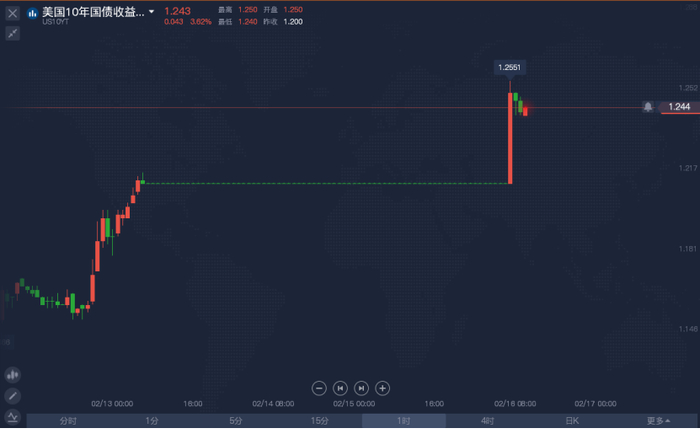 周二早盘开盘十年期美债大幅跳升,最高触及1.2551%。