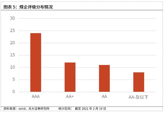 从评级等级来看,煤企发行人评级等级均较高。具体来看,AAA等级主体共有24家,AA+等级主体共有12家,AA等级发行人共有11家,AA-等级发行人共有5家。AA-等级以下的发行人共有3家,分别为永泰能源、永煤控股和霍煤集团。