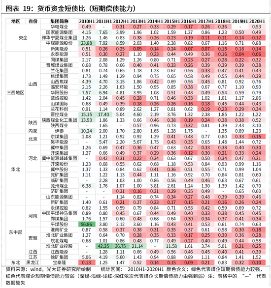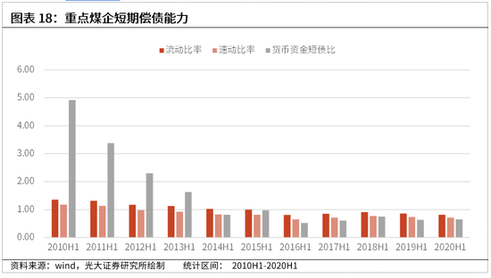 从短期偿债能力来看,近年来煤企的短期偿债能力虽有所修复,但行业整体短期偿债能力依旧偏弱。截至2020年年中,流动比率与速动比率分别为0.82与0.71;货币资金短债比仅为0.65。