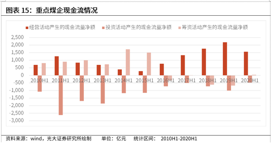 现金流方面,从经营性现金流来看,经营性现金流与公司盈利能力表现基本一致,2015年经营性现金流处于历史低位,随着去产能的有序推进,经营性现金流自2016年后稳步上升,2019达到历史高点。2020年受疫情影响,企业经营状况受损,2020年上半年行业整体经营性现金流小幅回落。从投资性现金流来看,受煤企经营困境的影响,自2011年后,投资性现金流净流出逐年递减,随着全行业盈利能力的修复,投资性现金流出自2017年开始有所增加。筹资型现金流方面,自2016年后,筹资性现金流呈现持续净流出状态,或因煤企基本面边际修复,融资需求降低,2020年上半年筹资性现金流由负转正。