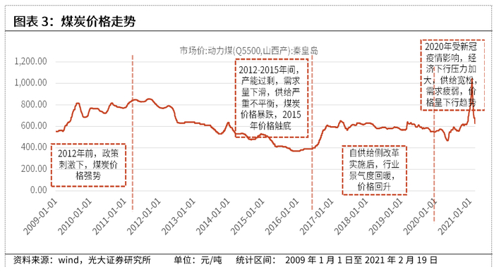 2020年以来:2020 年初,随着去产能任务完成和先进产能的逐步释放,叠加新冠疫情对煤炭下游需求的影响,煤炭行业供需形势趋于宽松,煤炭价格下行,2020年二季度以来随着下游企业复工复产,煤炭需求保持复苏态势,价格有所回升,但全年煤炭销售均价仍呈下降走势。