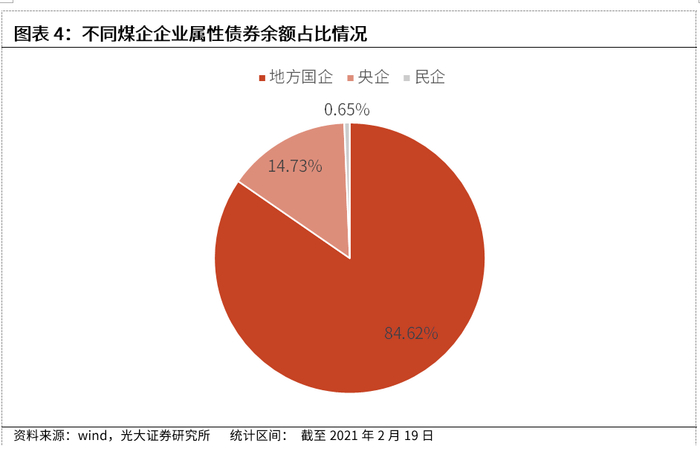 从企业属性来看,煤炭企业发债主体多为国企。其中共有6家为中央国有企业,其余大多为地方政府国有企业,债券余额占比分别为14.73%和84.62%。民营企业仅有5家,仅占比0.65%。从煤企大部分是国有企业的角度来看,其具有一定的公益属性,承担着“三供一业”及地方公益职能。