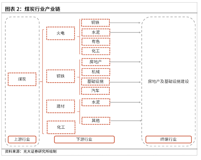 煤炭行业直接的下游行业一般分为四大行业:火电、钢铁、建材和化工行业,四大行业耗煤合计占比超过80%。其中,电力行业占煤炭消费占比最高,钢铁行业、建材行业消费量占比次之,化工行业占煤炭消费的比例相对较低。我们循着煤炭的直接下游行业继续分析,可追踪到煤炭消费的最终端。火电的下游行业分别为钢铁、水泥、有色、生活消费及化工;钢铁的下游行业分别为房地产、基础设施建设、机械等;水泥下游行业为基础设施建设及房地产。由此我们可以看出,煤炭最终的消费行业主要指向了房地产及基建行业。因此,基建投资和地产投资的变动是引导煤炭行业变动的根源,而这两者又与宏观政策紧密相关。综上,从政策设计及预期、下游基建和地产投资变动到中游钢铁、电力等行业的变动、都是煤炭行业基本面分析中需要关注的重点。