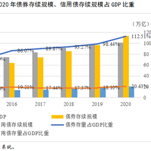 2020年,我国信用债发行规模约10.94万亿元,同比增长30.86%,占2020年GDP比重为10.77%,比2019年增加2.30个百分点;信用债存续规模为20.76万亿,同比增长16.24%,信用债存续规模占2020年GDP比重为20.43%,比2019年增加2.33个百分点。