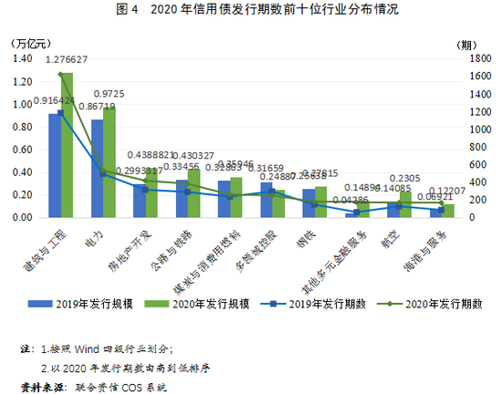 2020年,新发公司信用类债券中,建筑与工程行业新发行债券最多,达到1.28万亿元,占比11.70%,原因是在疫情影响下政策大力支持新基建,导致建筑与工程行业融资需求增加;电力行业新发行债券规模排名第二,达到0.97万亿元,占比8.87%,原因是随着2020年复工复产的持续推进,生产生活用电量快速上升,电力行业融资需求增加;房地产开发行业新发行债券规模排名第三,达到4388.82亿元,占比4.02%,原因是受到疫情的影响,房企资金回笼速度放缓,开发商需要通过债券等融资渠道来缓解现金流紧张问题。