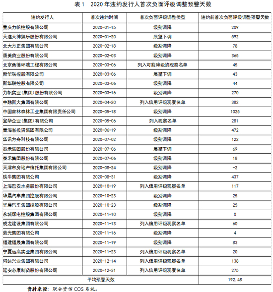 2020年,违约发行人的评级机构首次负面评级调整预警天数平均为192.48天,评级预警时间超过半年,起到了良好的风险预警作用。2021年,在复杂的市场环境下,评级机构作为市场信用风险防范的第一道防线,将牢记初心,回归本源,竭诚为投资者服务。