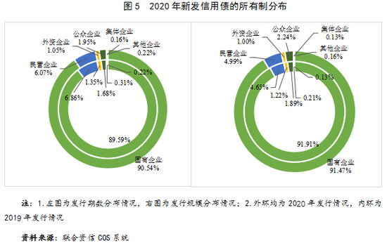 2020年,新发公司信用类债券中,国有企业依然是非金融企业所发债券最多的企业类型,其所发债券的期数和规模在非金融企业所发债券总发行期数和总发行规模中的占比分别为90.54%和91.47%,与上年基本一致,民营企业所发债券的期数和规模占比分别为6.07%和4.99%,也与上年基本相同。民营企业占比较少的主要原因是民营企业违约风险持续暴露,投资者对民营企业偿债能力的认可度要低于国企,投资者普遍存在规避民企违约风险的心态。