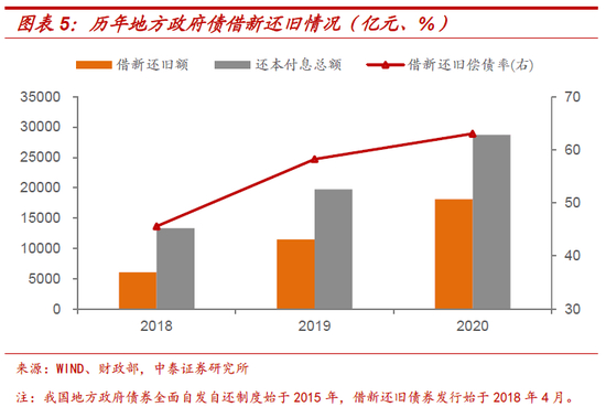 其中,债务率和偿债率的定义如上文所述。逾期债务率指的是年末逾期债务额占年末债务总余额的比重,该指标较高表明政府已出现偿债困难,存在较高风险。不过,地方政府可以采用借新还旧等方式化解逾期,从研究角度很难获取逾期债务的真实数据,该指标参考价值不大。借新还旧偿债率即举借新债偿还债务本息额占当年债务还本付息总额的比重,2020年底我国地方政府该指标达到63%,表明政府对举借新债偿还债务的依赖程度上升较快,偿债风险较高。