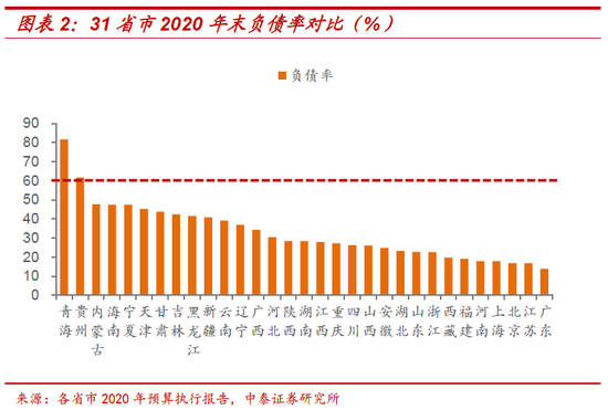 负债率是政府债务余额和GDP的比值,衡量经济规模对债务的承担能力,一般用于国家主体间横向比较。参考欧盟《马斯特里赫特条约》规定,警戒线为60%。2020年底我国地方政府债务余额25.66万亿元,加上中央政府债务余额20.89万亿元,全国政府债务余额46.55万亿元,由此计算的负债率为45.8%[2],整体上风险仍然可控。具体到地区层面,2020年末仅两个省负债率超过60%,分别是青海(81.7%)、贵州(61.6%),意味着两地区债务规模和经济体量并不匹配。