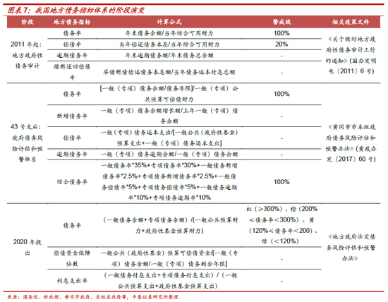 我国地方债务指标体系演变分为三个阶段。中央对于地方政府债务风险的关注由来已久,2011年开始的第一轮地方政府性债务审计中,为了衡量地方各级政府负有偿还责任债务(法定债务)的风险,制定了4个分析指标:债务率、偿债率、逾期债务率、借新还旧偿债率。2014年新《预算法》通过和国发43号文出台后,各级政府相继出台“政府债务风险评估和预警办法”,以债务率作为主要指标,新增债务率、偿债率、逾期债务率等作为辅助指标。年初以来,不少地方政府预算报告中提到根据法定债务率水平由高到低设置红、橙、黄、绿四个风险等级档次,主要指标为债务率,辅助指标为偿债资金保障倍数和利息支出率,口径略有变化。