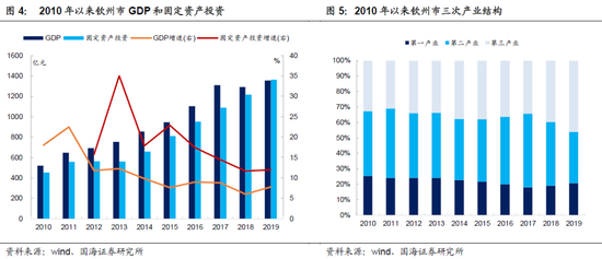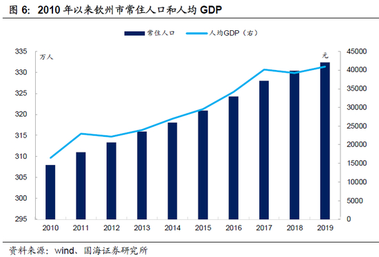 从产业发展上来看,钦州市在较为丰富的海岸线和后备土地资源的基础上,临海工业发展较为成熟,目前已形成了石油加工、农副产品加工、化学原料和化学制品制造、黑色金属冶炼和压延加工、电力/热力生产和供应、木材加工、造纸和纸制品、非金属矿物制品、医药制造和黑色金属矿采选等十大重点产业,石油加工业也已经成长为钦州支柱产业。近几年,钦州市产业结构持续优化,2019年三次产业结构为20.6:33.3:46.1。