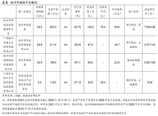 截至2020年末,钦州市有存续城投债的城投平台共4家,包括钦州市开发投资集团有限公司(“钦州开投”)、广西钦州临海工业投资集团有限公司(“钦州临海”)、钦州市滨海新城投资集团有限公司(“钦州滨海新城”)和广西中马钦州产业园区投资控股集团有限公司(“钦州中马产投”),其中钦州开投持有钦州临海50%股权。
