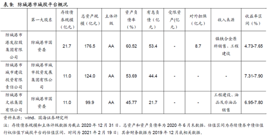 由于南宁经济财政实力较强、广义债务率相对可控,南宁经开区在五象新区建设中战略定位较高,以及防城港市广义债务率在自治区内相对较低,我们认为可进一步关注南宁威宁投资、南宁绿港建投和防城港文旅的布局机会。
