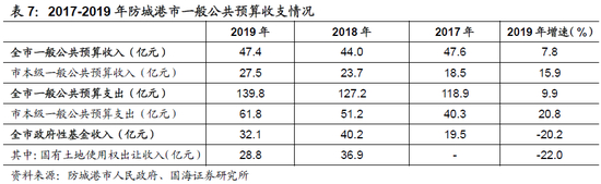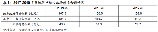 债务率方面,以(地方政府债务余额/综合财力)作为债务率的衡量指标,则2019年防城港市债务率为54.3%,在自治区内相对处于中下游水平。