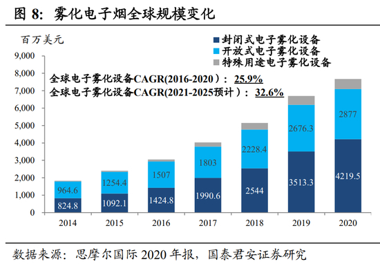 作为典型成瘾性赛道,电子烟市场的扩张有较大的确定性。中上游的制造企业除了关注政策走向之外,可以更多对标国际市场的增长。根据佛若斯特沙利文的预测,2023年,全球新兴烟草市场规模将高达1734亿美元。