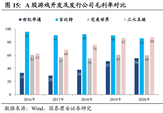 中游的游戏开发公司很多,无形资产占比大,商誉较多,毛利率能达到50%以上。