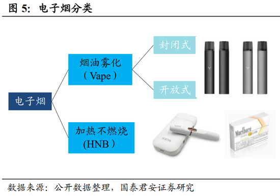 电子烟,通过各种方式减少燃烧有害物的替代电子设备,目前主要分为两种,一种是蒸汽式电子烟(Vape),一种是加热不燃烧电子烟(HNB)。