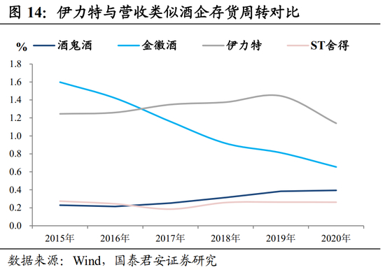 新疆由于受到二次疫情的影响,伊力特的营收在2020年出现了22.69%的下滑。从历史指标来看伊力特的运营相对稳定。由于区域性酒企、和主要产品为中高端的酒企在报表上差距较大,选择和伊力特营收类似四家酒企进行一些指标比较。伊力特的盈利和周转都相对比较稳定。