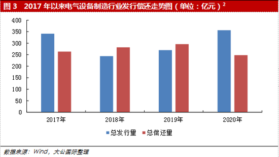 电气设备制造行业新发债券仍以中长期为主;2020年以来,受国家加大减税降费及整体流动性宽松影响,新发债券规模有较大增长;截至2020年末,行业内债券集中在一年以内及2~3年到期,面临一定短期偿债压力。