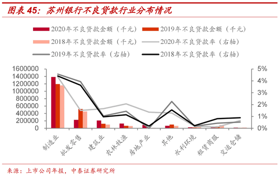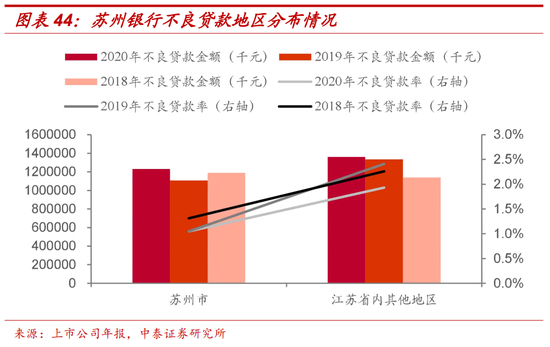 从不良贷款的地区分布来看,2020年末不良贷款中,苏州地区占比47.51%,江苏省内其他地区占比分别为52.49%。不良贷款率方面。苏州地区较上年末持平,为1.05%,江苏省内其他地区较上年末下降0.48个百分点,为1.93%。