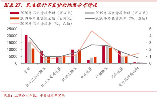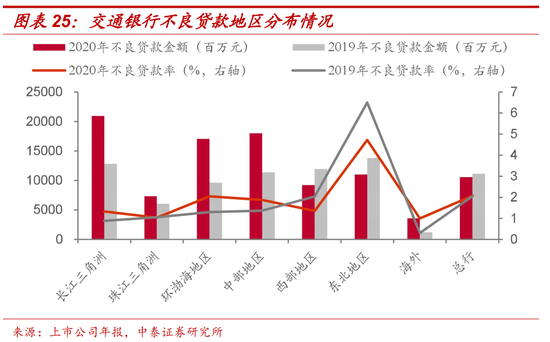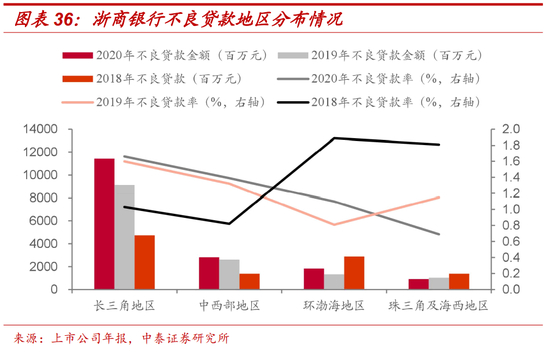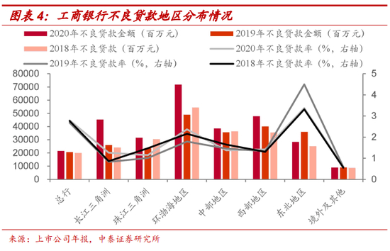 2020年商业银行的不良贷款总额有了较为明显的增长,整体不良贷款率提高。在地区分布上,通过梳理38家上市银行年报发现,东北地区、中西部地区和环渤海地区的不良贷款率相对较高。