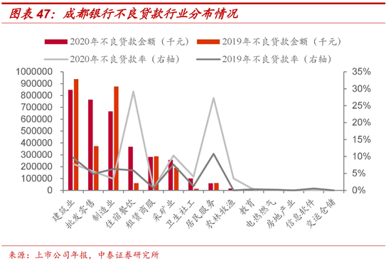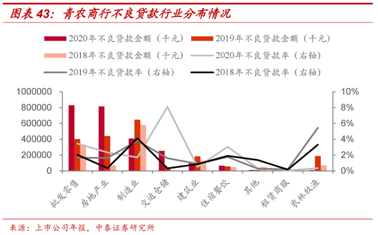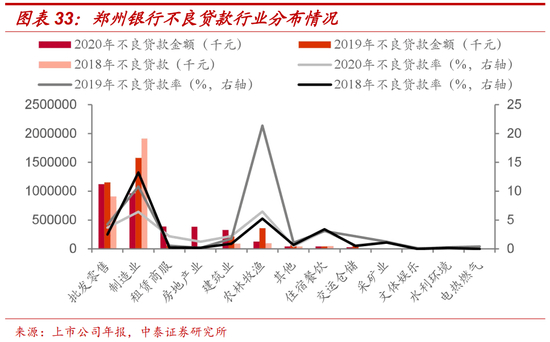 不良贷款的行业分布方面,不良贷款率排前三位的行业为批发和零售业(7.16%)、建筑业(5.84%)、制造业(3.38%)。其中,批发和零售业2020年不良贷款率较上年末下降0.92个百分点,建筑业较上年末上升3.24个百分点,制造业较上年末下降2.71个百分点。不良贷款余额前三位的行业为批发和零售业(112.34亿)、制造业(110.62亿)和房地产业(96.33亿),
