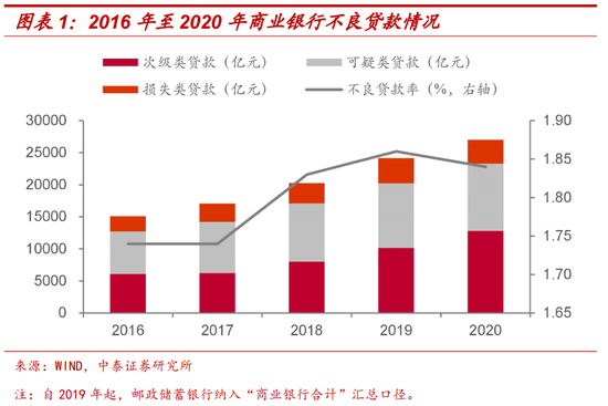 受新冠疫情影响,经济承压前行,2020年商业银行不良贷款规模明显上升。银监会公布的《商业银行主要监管指标情况表(2020年)》[1]显示,2020年不良贷款余额为27015亿元,较2019年的24135亿元增长11.93%,其中次级类、可疑类贷款分别同比增长26.11%、4.14%,损失类贷款同比下降4.77%。2020年不良贷款率为1.84%,一改往年增长态势,较2019年同比小幅下跌。