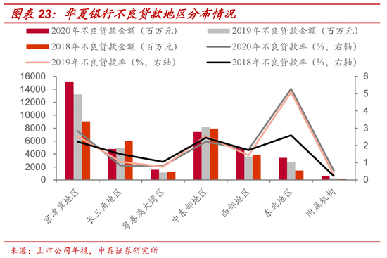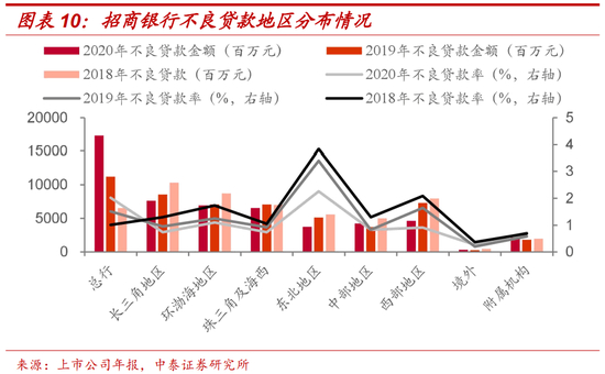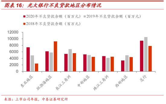 不良贷款率较高的区域有东北地区(2.26%)、总行(2.02%)、环渤海地区(1.10%)。其中,总行不良贷款率增加较快,较上年末增加0.51个百分点。