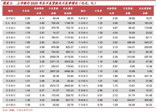 具体来看, 不良贷款率最高的三家上市银行分别为郑州银行(2.08%)、民生 银行(1.82%)、华夏银行(1.8%)。关注类贷款的风险贷款比率最高的三家上市银行分别为青农商行(6.27%)、华夏银行(5.23%)、民生 银行(4.8%)。