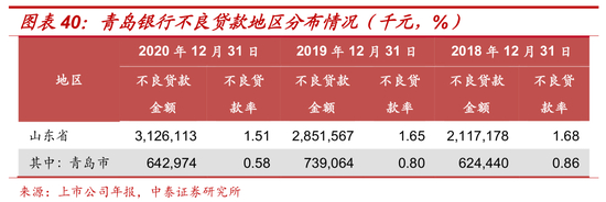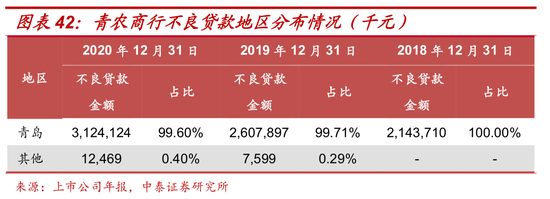 从不良贷款的地区分布来看,2020年末不良贷款中,青岛地区不良贷款余额为31.24亿,占比99.60%,其他地区不良贷款余额为0.12亿,占比为0.40%。