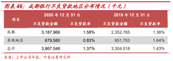 从不良贷款的地区分布来看,2020年末不良贷款中,成都地区占比82.43%,其他地区占比分别为17.57%。不良贷款率方面,成都地区较上年上升0.22个百分点,为1.58%,其他地区较上年末下降0.81个百分点,为0.83%。