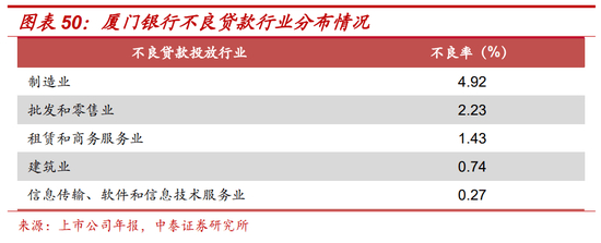 与公用事业相关行业的不良贷率较低。上市银行不良贷款率普遍较低的行业主要分布在电力、热力、燃气及水生产和供应业,水利、环境和公共设施管理业,科教文卫业,金融业,信息传输、软件和信息技术服务业。