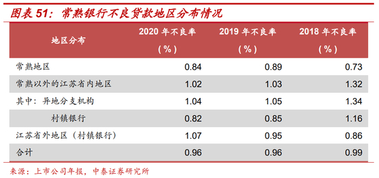 截至2020年末,常熟银行不良贷款余额12.64亿元,较上年末增长2.08亿元,增幅19.63%,不良贷款率为0.96%,与上年末持平。从地区分布来看,2020年末常熟地区不良率为0.84%,常熟以外的江苏省内地区不良率为1.02%,江苏省外地区(村镇银行)不良率为1.07%。