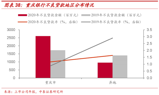 从不良贷款的地区分布看,2020年末不良贷款中,重庆市占比73.16%,异地占比26.84%。不良贷款余额变动方面,重庆市不良贷款余额从2019年末的17.28亿增加到26.07亿,上升50.9%,异地从2019年末14.03亿下降到9.56亿,下降31.84%。
