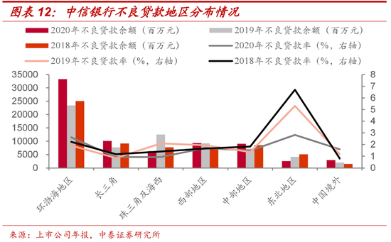 从不良贷款的地区分布来看,2020年末不良贷款中,长江三角洲地区占比21.43%,中部地区占比为18.43%,环渤海地区占比为17.46%。不良贷款率方面,环渤海地区上升0.75个百分点,为2.05%,海外地区上升0.69个百分点,为1%。不良贷款余额变动方面,海外地区不良贷款余额从2019年12.13亿增加到2020年的35.86亿,上升195.63%;环渤海地区从2019年的96.46亿增加到2020年的170.58亿,上升76.84%。