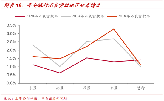 不良贷款率较高的区域有西区(1.53%)、总行(1.41%)、北区(1.29%)。在所有地区中只有总行不良贷款率增加,较上年末上升0.40个百分点,其余区域不良贷款率均有所下降。